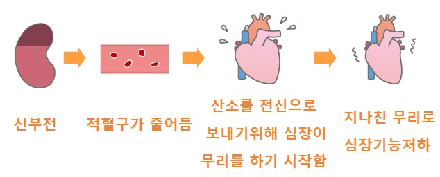 위의 그림과 같이 신장기능의 악화, 신장기능의 악화로 인한 빈혈, 빈혈로 인한 각 장기의 산소부족을 대처하기위한 심장의 과잉작업, 심장의 부담으로 인한 신부전이 이루어지게 됩니다.