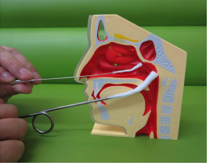 상인두 도포 치료에서는에서는 0.5%~1% 염화아연 용액을 스며들게 한 면봉을 좌우 양쪽 코와 목에 삽입하여 상인두에 약물을 바릅니다.