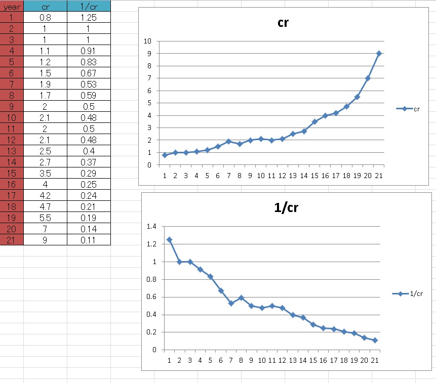 20년간의 cr과 역수, 그래프 그리고 예상 투석시기